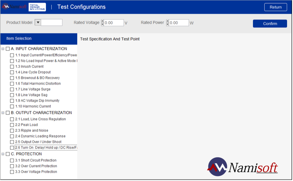 | 输入功率测试 | 关机时间测试 | 直流输出电流测试 | 电压稳定性测试 | 过载保护测试 |