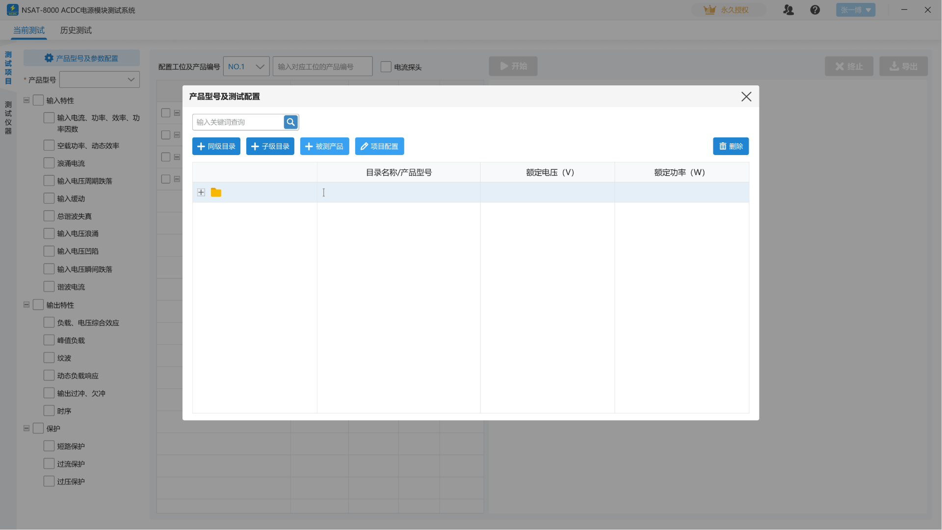 测试项目模块点击产品型号及测试配置,输入主目录名称,可添加同级目录及子级目录。