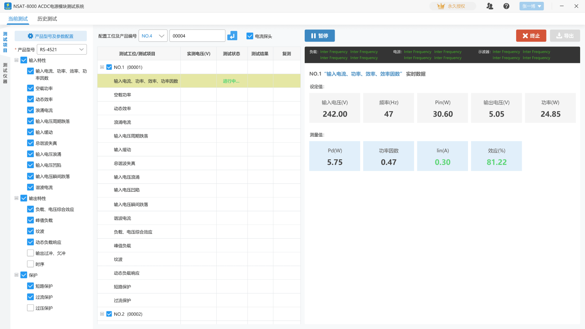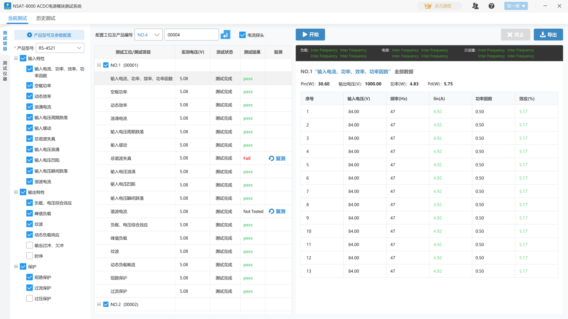 点击开始按钮后,系统开始运行测试,界面右侧显示每个测试点的实时数据,表格中会同步测试状态,