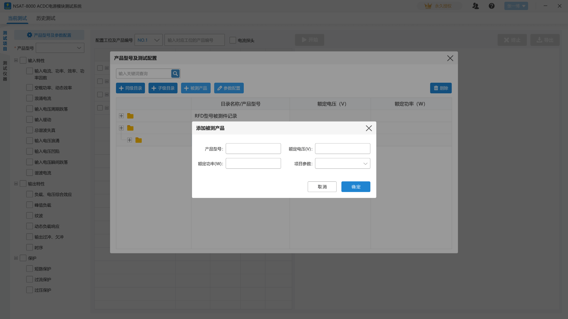 点击添加被测产品按钮,输入产品型号、额定电压、额定功率,选择项目参数,点击确认按钮,被测产品添加完成。