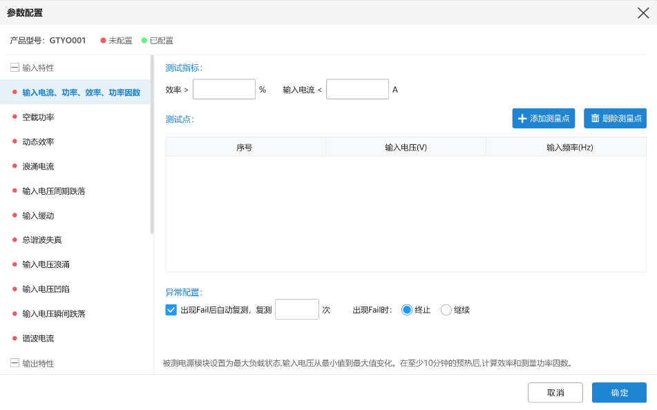 点击参数配置按钮,输入每个测试点的测试指标等参数,已配置的测量点前面显示绿色,未配置的显示红色,参数配置完点击确认按钮。