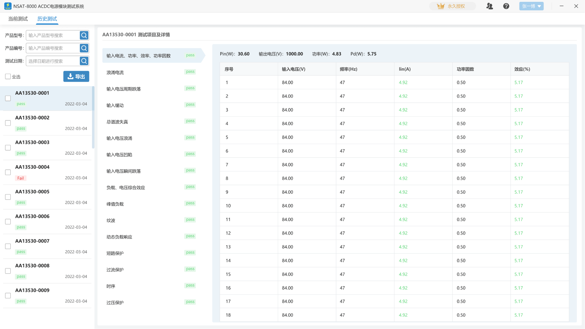 历史测试模块可以根据产品型号、产品编号、测试日期进行查询,选中该条数据,界面会显示测试项目及详情,点击导出按钮即可导出测试数据。