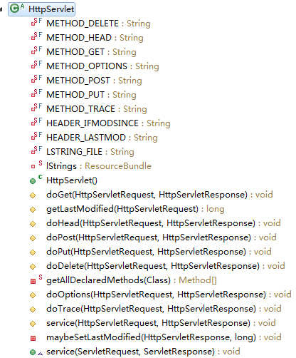 ●对GenericServlet进行了进一步的封装和扩展,更贴近HTTP协议下的应用程序编写,在service(ServletRequest req, ServletResponse res)方法中,根据不同HTTP请求类型调用专门的方法进行处理。