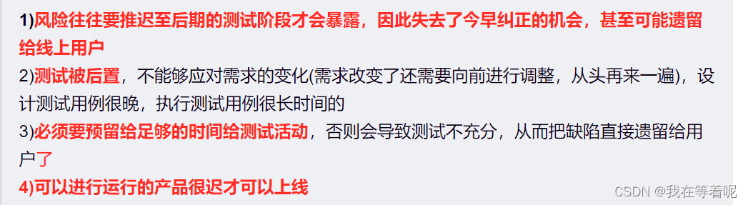 2.1)测试被后置,风险往往要推迟至后期的测试阶段才会暴露,因此失去了今早纠正的机会,还需要向前回溯,向前返工,交付产品周期拉长;