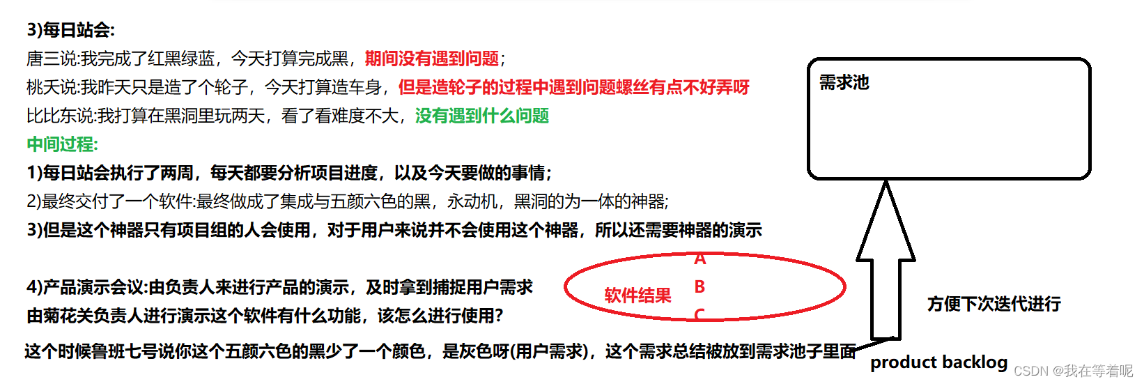 4)还有需求池里面的需求是供应不断的呀,产品经历在不断的收集需求,一方面也表现出来敏捷模型是能够及时地捕捉用户的需求,捕捉我们产品的变化,为了让产品功能更符合用户的需求,一直是精益求精的过程;