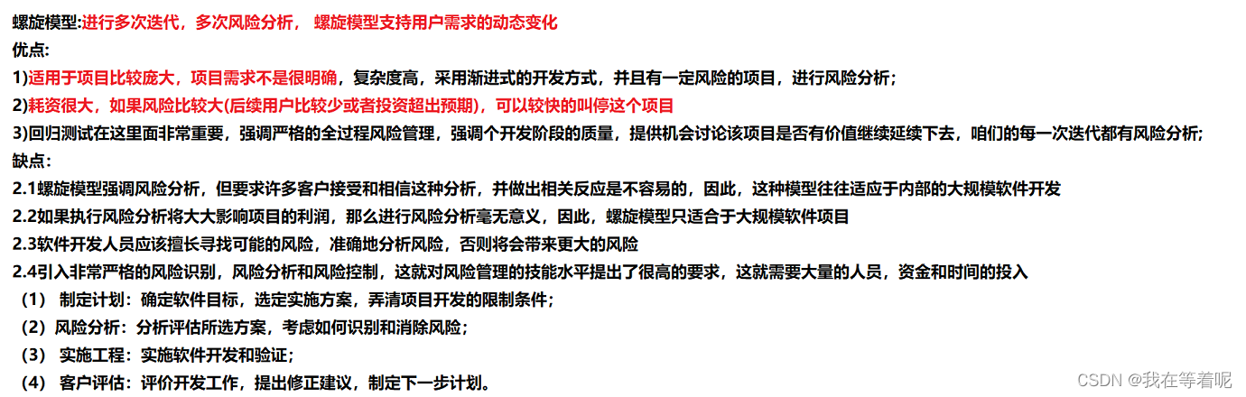 二:螺旋模型:在瀑布模型的基础上引入全流程的风险分析,适用于规格较大,复杂度比较高的项目