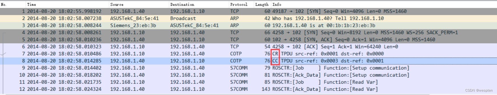 这里wireshark为我们标注出了CR和CC,后面的COTP包都是DT,这里的CR和CC其实分别是connect request和connet confirm的,也就是建立连接的过程,之后连接建立成功后,发送DT包,也就是data,是在发送数据。