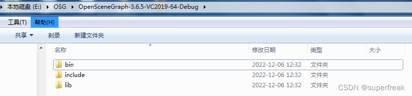 OpenSceneGraph | Objexx Engineering,下载,我下载的是和VS2019配套的那个,下载后解压到E盘,OSG目录下,形成如下目录就ok。
