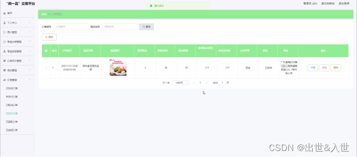 订单管理,在订单管理页面中通过填写订单编号、商品名称、商品图片、购买数量、价格/积分、折扣价格、总价格/总积分、折扣总价格、支付类型、状态、地址等内容进行详情、删除,如图5-11所示。