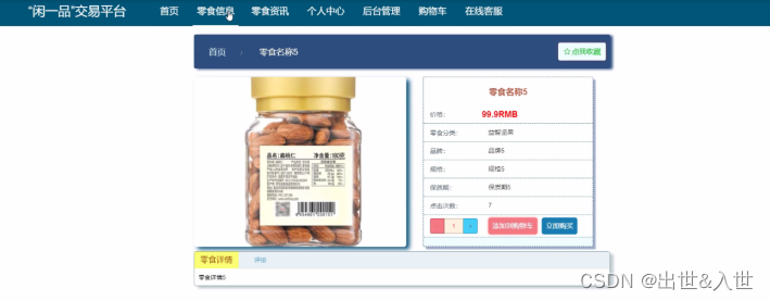 闲一品交易平台,在闲一品交易平台可以查看首页、零食信息、零食资讯、个人中心、后台管理、购物车、在线客服等内容,如图5-12所示。