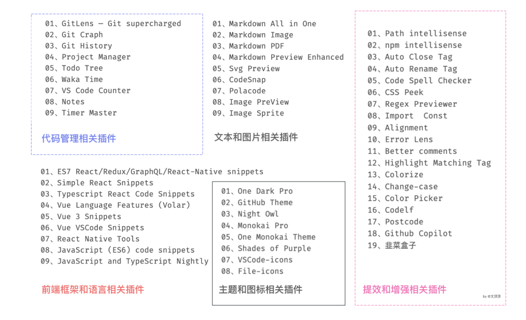 本文介绍前端开发领域常用的一些VSCode插件,插件是VSCode最重要的组成部分之一,本文列出了我自己在以往工作经验中积累的54款插件,个人觉得这些插件是有用或有趣的,根据它们的作用,我粗略的把它们分成了代码管理、文本和图片处理、前端框架和语言相关、提效和功能增强以及主题和图标等几个模块。