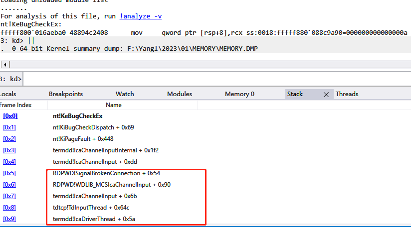 系统蓝屏后给出Windows系统内核转储文件,真是太棒了,拿到转储用WinDBG简单看一下就知道是受到BlueKeep攻击了,下面是Dump的 栈回溯