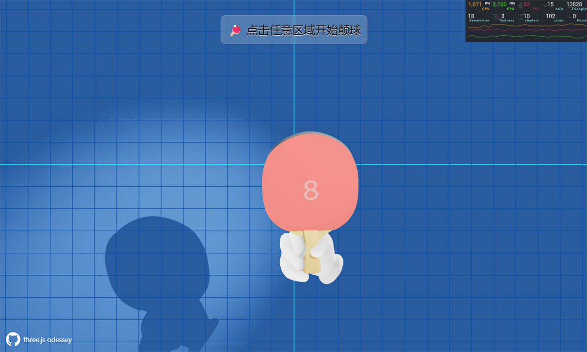 在正式学习之前,我们先来看看本文示例最终实现效果:页面主体内容是一个手握乒乓球拍的模型和一个乒乓球 🏓,对球拍像现实生活中一样进行颠球施力操作,乒乓球可以在球拍上弹起,乒乓球弹起的高度随着施加在球拍上的力的大小的变化而变化,球拍中央显示的是连续颠球次数 5️⃣,当乒乓球从球拍掉落时一局游戏结束,球拍上的数字归零 0️⃣ 。快来试试你一次可以颠多少个球吧 😏。