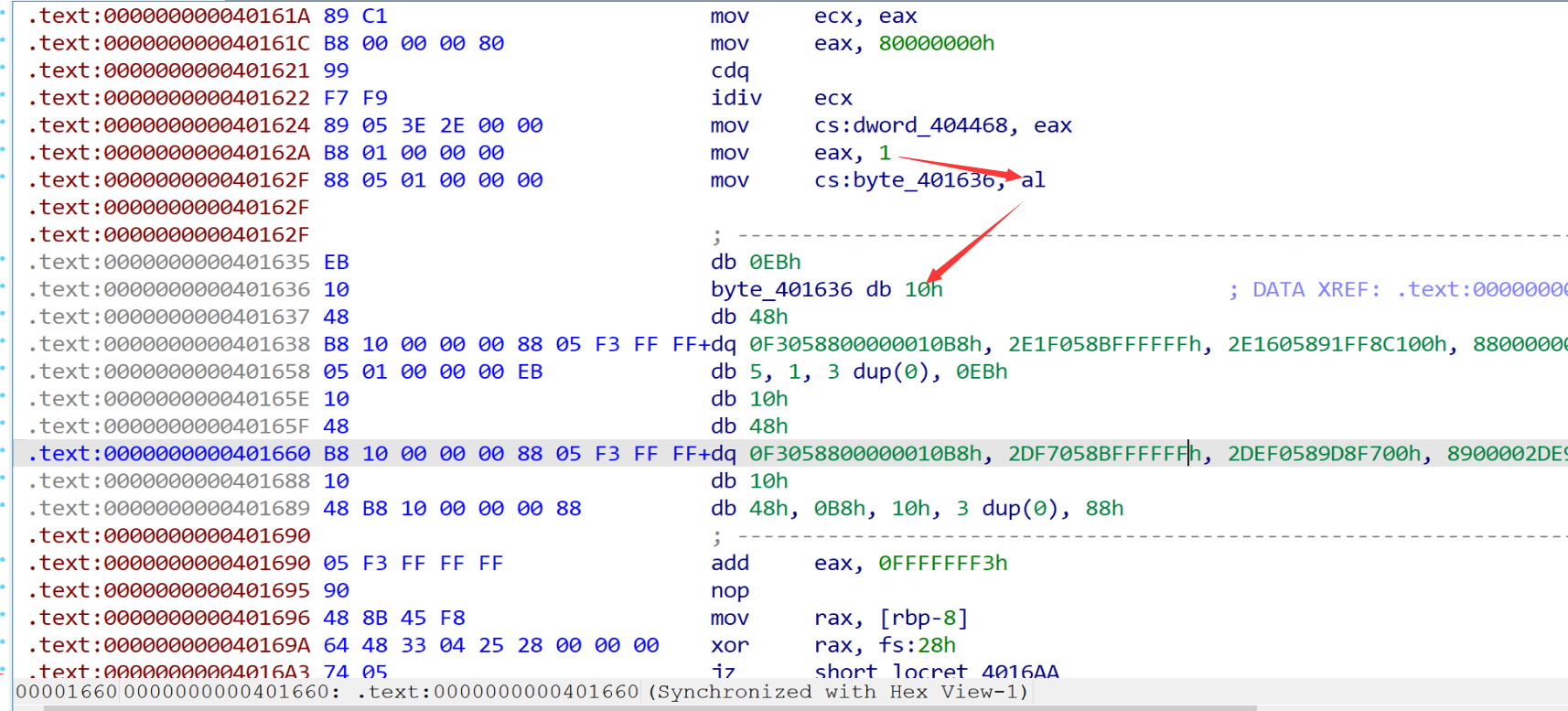 我们发现rax = s = "gdb",因此*(_WORD *)&s[strlen(s) - 2] = *(short*)&s[1] = 0x6264 = 25188,代入(*(_WORD *)&s[strlen(s) - 2] | 0x2020) - 25188) & 0x7FFFFFFF可得该式值为0,从而引发了除以0异常。不过相应的处理方法也很简单,在0x401622指令处下断点,将ecx的值改成一个正数即可。