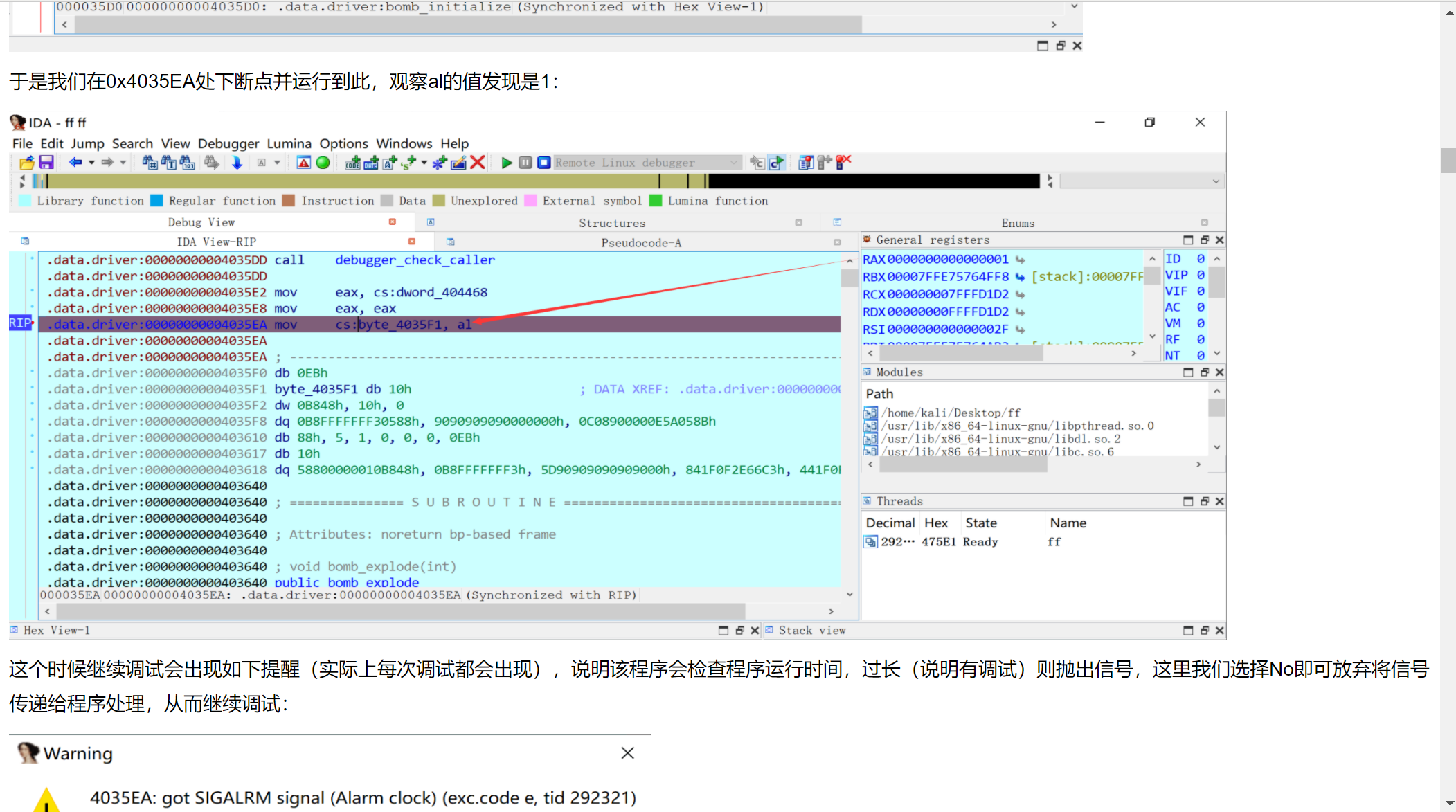 如果继续执行会发现程序由于除以0错误引发异常,从而进入explode函数,结合check_debugger名称我们可以推断出这个程序具有反gdb调试功能,因此我们可以考虑更换其他工具继续实验,这里我选择了IDA pro。