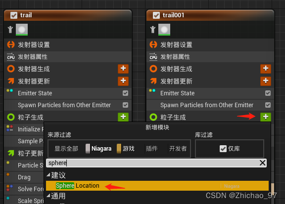 添加“Spawn Particle from Other Emitter”模块