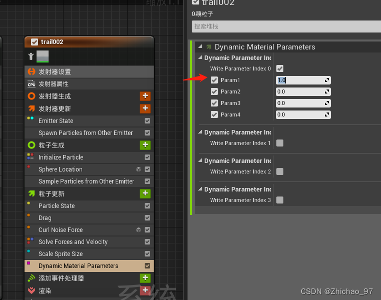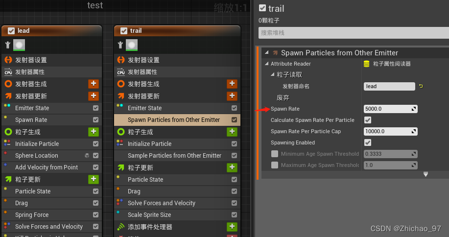 将“Spawn Particle from Other Emitter”模块的位置移到“Initialize Particle”模块的下方