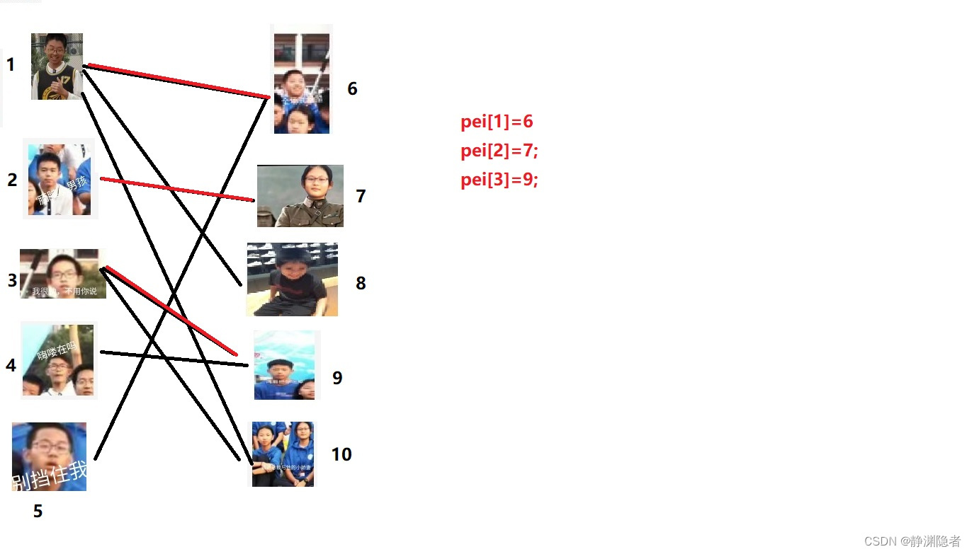 第一个找到的就是6号点,那么就将match[1]=6,match[6]=1,配对成功。