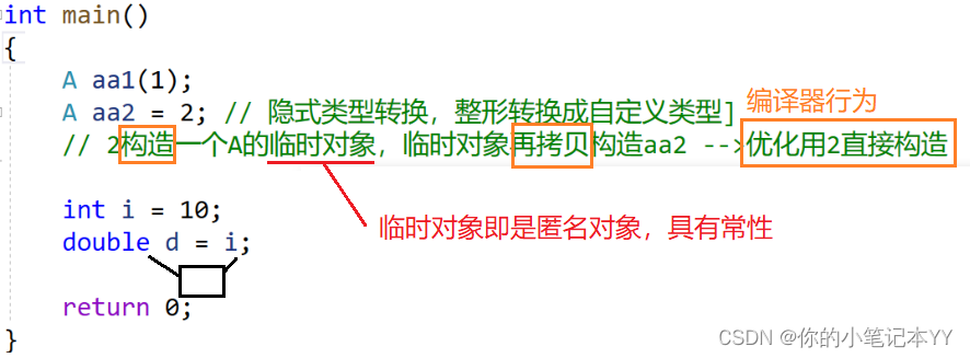 class Date { public: // 1. 单参构造函数,没有使用explicit修饰,具有类型转换作用 // explicit修饰构造函数,禁止类型转换---explicit去掉之后,代码可以通过编译 explicit Date(int year) :_year(year) {} /* // 2. 虽然有多个参数,但是创建对象时后两个参数可以不传递,没有使用explicit修饰,具有类型转 换作用 // explicit修饰构造函数,禁止类型转换 explicit Date(int year, int month = 1, int day = 1) : _year(year) , _month(month) , _day(day) {} */ Date& operator=(const Date& d) 拷贝构造 { if (this != &d) { _year = d._year; _month = d._month; _day = d._day; } return *this; } private: int _year; int _month; int _day; }; void Test() { Date d1(2022); // 用一个整形变量给日期类型对象赋值 // 实际编译器背后会用2023构造一个无名对象,最后用无名对象给d1对象进行赋值 d1 = 2023; }