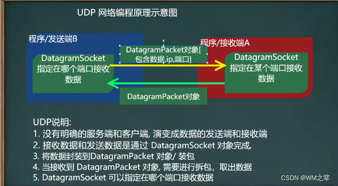 DatagramSocket对象,用于发送数据。DatagramPacket对象,将要发送的数据放入其中,并指定目标主机的IP地址和端口号。DatagramSocket的send()方法发送数据包。DatagramSocket以释放资源。接收端(服务器端):