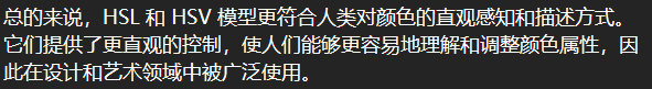 可以看到,HSV越偏向右上角饱和度和亮度越高。但HSL则是偏向于截面的中间饱和度和亮度越高。