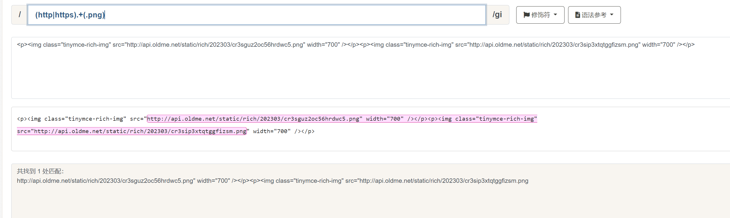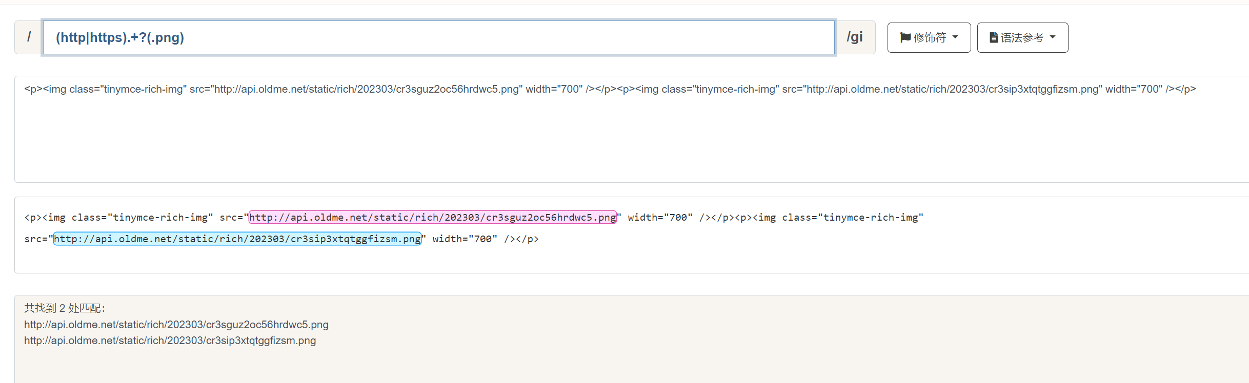 示例文本中存在两个 .png 的图片,我们使用 (http:https) 来匹配 http 或者 https 开头,然后使用 . 来匹配所有字符,再加上 + ,表示一次或多次匹配,最后使用 (.png) 表示匹配 .png 结束。但这样的结果就是当我们遇到第一个 .png 时,.+ 也会匹配到 .png,所以就导致了获取了错误的匹配结果。遇到这种情况,我们就要使用非贪婪模式,在 + 后面加上 ? :