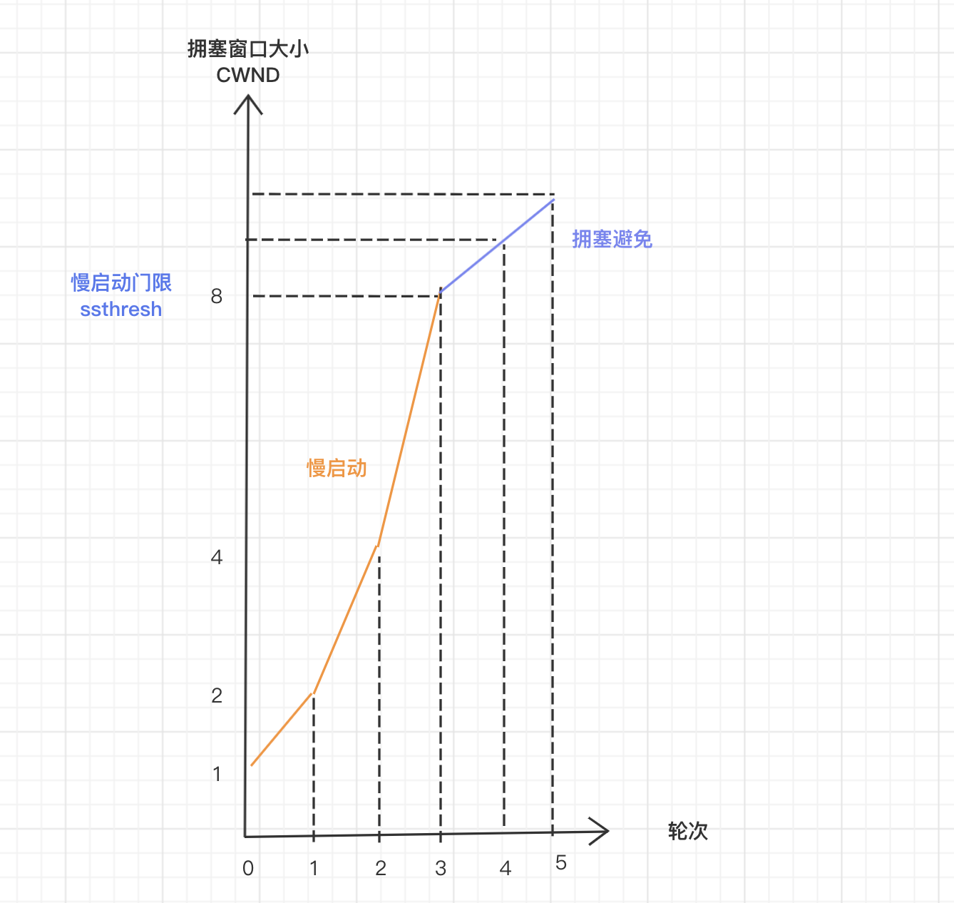 当一个新的TCP连接开始时,无法确定是否用拥塞发生,一开始不会发送大量的包,而是从最小的发送窗口开始,后续会采用倍增的方式增加窗口的大小,窗口大小从 1 开始,后续慢慢增大到 2、4、8 等。