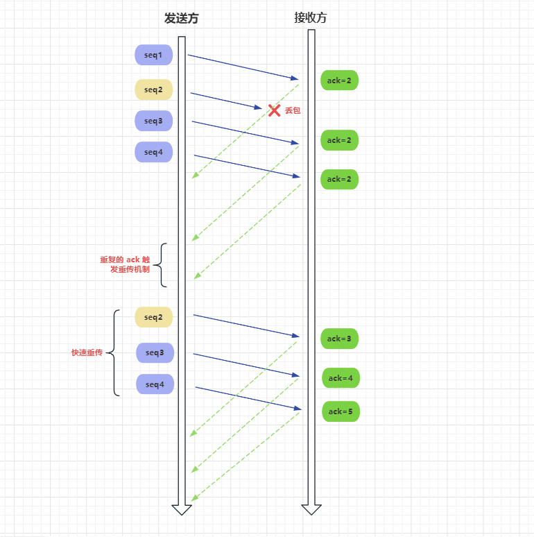 上面的超时重传速度变化太快,而快速重传是一个相对温和的方案。如果我们连续 3 次收到同样序号的 ACK,包还能回传,说明这个时候可能只是碰到了部分丢包,网络阻塞还没有很严重,无需重置 cwnd。