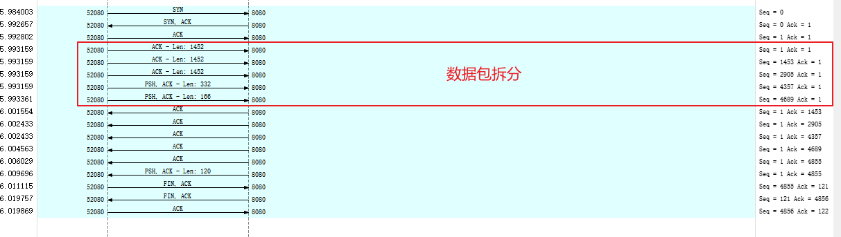 TCP 发送比较大的数据包,TCP 会一次性发送大的数据包给接收方?答案是不会的,需要考虑网络带宽,TCP 会将大的数据包拆分成多个大小适中的数据包,发送一个 http 请求,添加较大的参数,使用 Wireshake 抓取数据包: