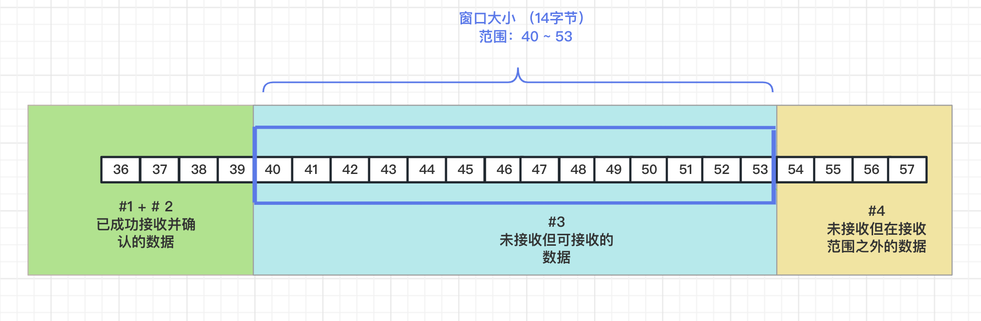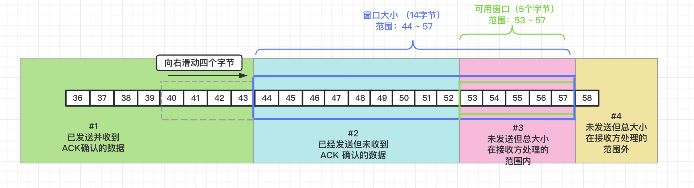 随着 ACK 的确认,窗口也会依次向右滑动,比如发送端的窗口中,比如 40 ~ 43 字节都收到了 ACK 确认,那么整个可用的窗口就会顺次往右移动。此时 53 ~ 57的数据也都能发送了。