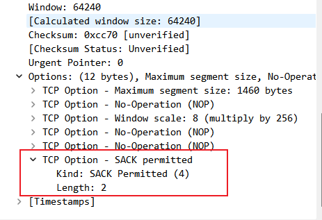 这种方式需要 TCP 报文段选项加一个 SACK 字段,使用查看 Wireshake SYN 包中 SACK Permitted: