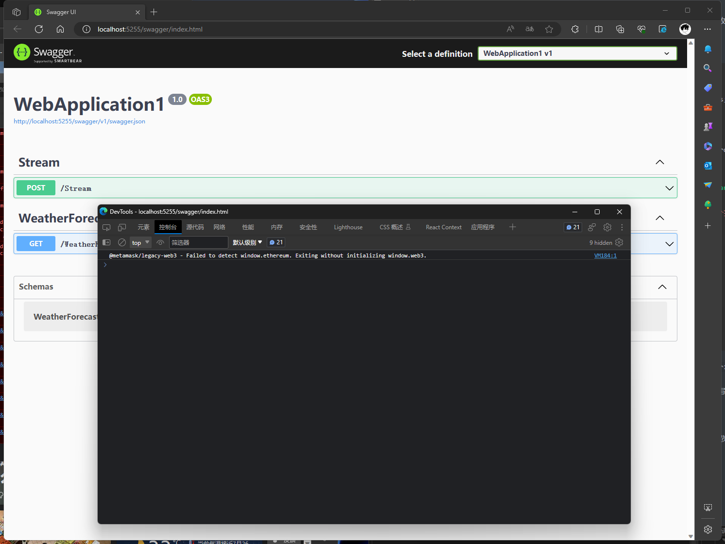 首先启动api服务,然后在打开的swagger的浏览器界面中打开开发者工具使用F12打开开发者工具