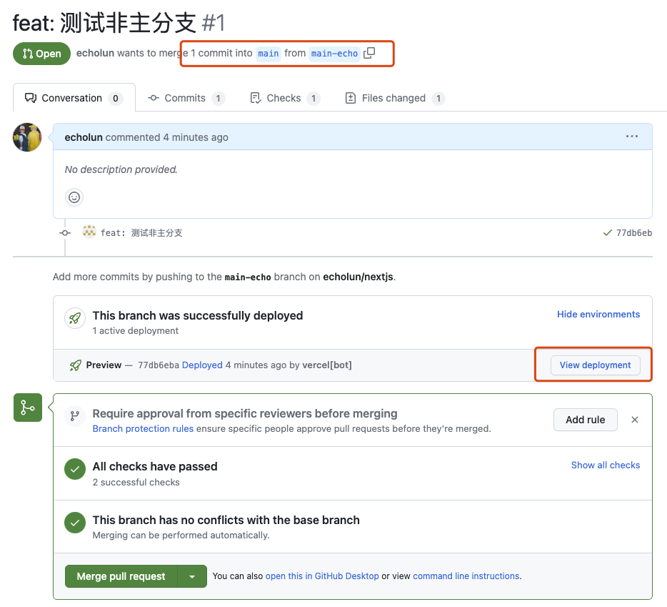 上图就是我基于主分支 main 切出了一个开发分支 main-echo,然后给 main 分支提了一个 PR,在 PR 合并页面你能看到 GitHub 这里直接给出了 main-echo 分支的部署预览地址,之后我们合并 PR ,由于 main 分支代码发生改变,vercel 会自动帮你构建部署 main 分支,好处就是能保证每次部署前,你能直接看每个分支效果是否符合你的预期。