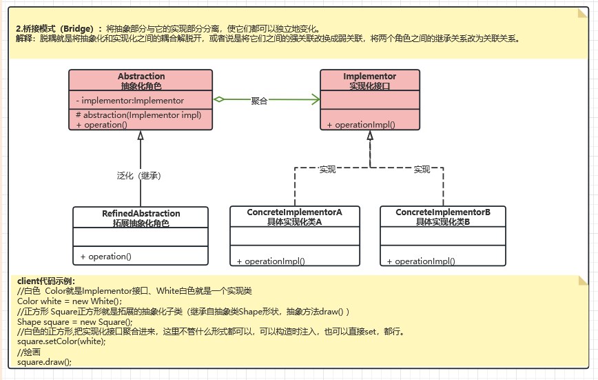 java.sql包下的Driver和Connection接口,通过DriverManager进行桥接(不像图中的聚合实现)。DriverManager定义了registerDriver和getConnection方法。registerDriver可以注册各种驱动。Connection接口可实现连接多种数据库。2个维度分开进行拓展实现,进行了脱耦。