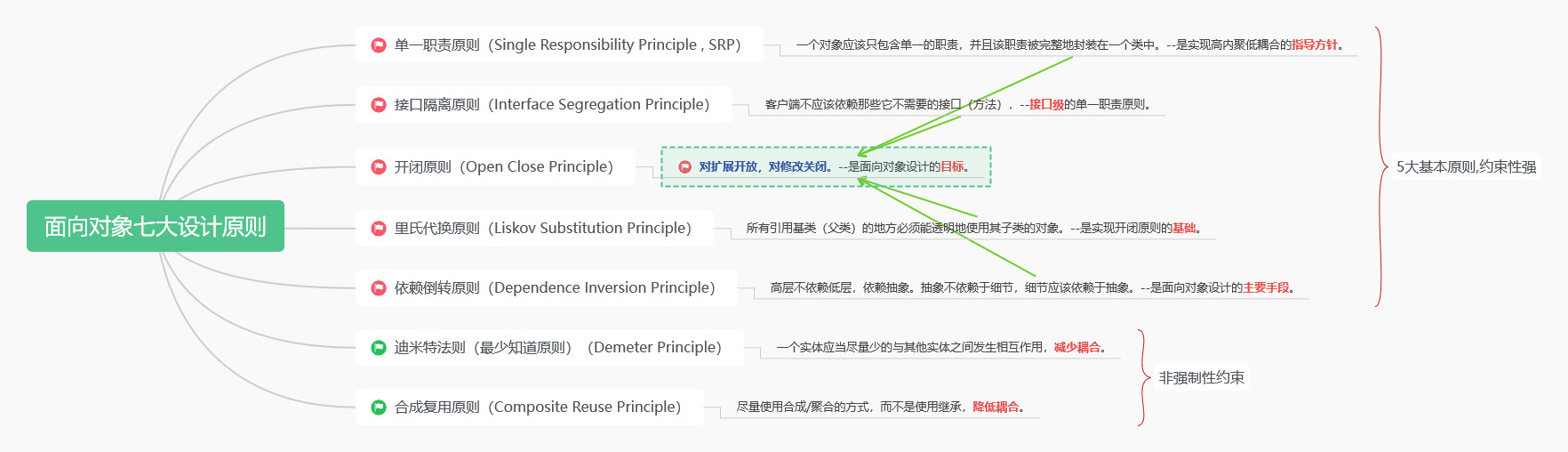 面向对象设计的目标之一就是支持可维护性复用,一方面需要实现设计方案的重用,另一方面要确保系统易于拓展和修改,具有较好的灵活性。7种面向对象设计原则,其中前5条是强约束性的建议都做到,后2条尽量做到即可。