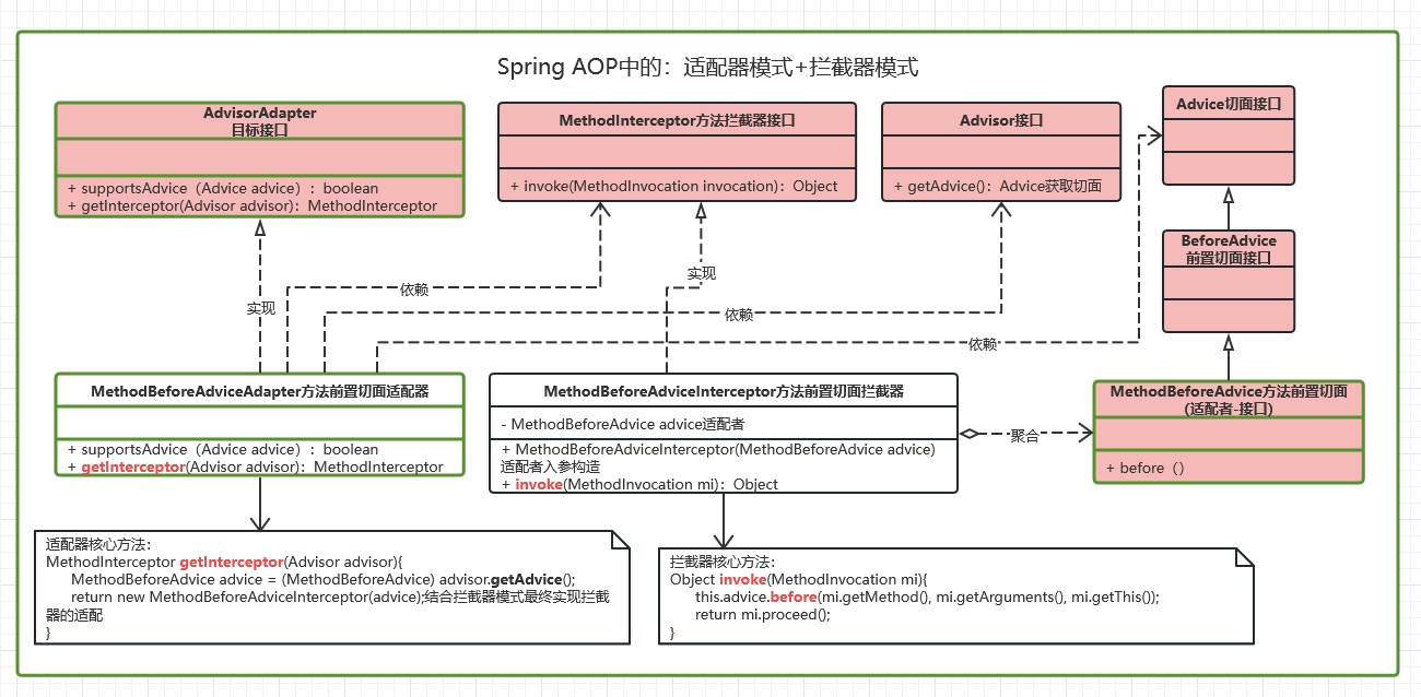- 适配器:MethodBeforeAdviceAdapter(advisor->advice)+MethodBeforeAdviceInterceptor(把适配者advice做入参构造,最终调用适配者方法执行)