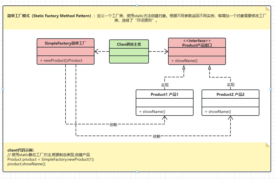 定义:定义一个工厂类,使用static方法创建对象。根据不同参数返回不同实例,每增加一个对象需要修改工厂类,违背了“开闭原则”。--不推荐使用。