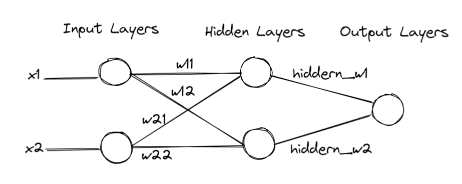 该神经网络示例中,包含一个输入层(2个节点),一个隐藏层(2个节点)和一个输出层(1个节点)。输入输出层之间以及隐藏层与输出层之间的所有节点均相互连接。激活函数为 Sigmoid 函数。