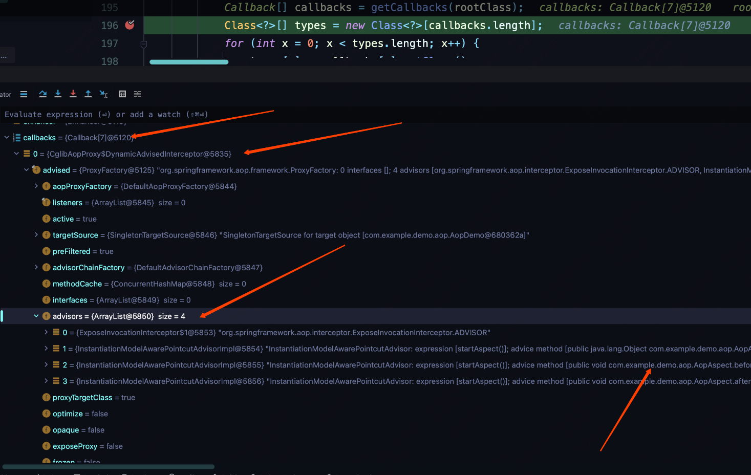 在第一个对调对象中持有的 advised 对象中有 advisors 属性,就是对应我们的代理类中四个切片,@Before等等。