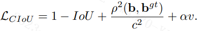 其中,ρ预测框和真实框的中心点的欧式距离,也就是图中的d,c代表的是能够同时包含预测框和真实框的最小闭包区域的对角线距离,v测量纵横比的一致性,α是正的权衡参数,