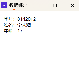 private void InitUI() { Title = "数据绑定"; Width = 240; Height = 185; // 创建Grid Grid layout = new(); // 设置为窗口内容 this.Content = layout; // 设置边距 layout.Margin = new Thickness(13.5d); // 三行两列 layout.ColumnDefinitions.Add(new ColumnDefinition() { Width = GridLength.Auto }); layout.ColumnDefinitions.Add(new ColumnDefinition(){ // 星号,即 1* Width = new GridLength(1.0d, GridUnitType.Star) }); layout.RowDefinitions.Add(new() { Height = GridLength.Auto }); layout.RowDefinitions.Add(new() { Height = GridLength.Auto }); layout.RowDefinitions.Add(new() { Height = GridLength.Auto }); // 六个block var tbIDf = new TextBlock(){ Text = "学号:" }; var tbNamef = new TextBlock() { Text = "姓名:" }; var tbAgef = new TextBlock() { Text = "年龄:" }; TextBlock tbIDv = new(); var tbNamev = new TextBlock(); var tbAgev = new TextBlock(); // 把六个block放到 grid 上 layout.Children.Add(tbIDf); layout.Children.Add(tbIDv); layout.Children.Add(tbNamef); layout.Children.Add(tbNamev); layout.Children.Add(tbAgef); layout.Children.Add(tbAgev); // Row、Column 附加属性 // 第一行第一列 Grid.SetRow(tbIDf, 0); Grid.SetColumn(tbIDf, 0); // 第一行第二列 Grid.SetRow(tbIDv, 0); Grid.SetColumn(tbIDv, 1); // 第二行第一列 Grid.SetRow(tbNamef, 1); Grid.SetColumn(tbNamef, 0); // 第二行第二列 Grid.SetRow(tbNamev, 1); Grid.SetColumn(tbNamev, 1); // 第三行第一列 Grid.SetRow(tbAgef, 2); Grid.SetColumn(tbAgef,0); // 第三行第二列 Grid.SetRow(tbAgev, 2); Grid.SetColumn(tbAgev, 1); // 数据绑定 /* ID */ Binding bindID = new(nameof(Student.ID)) { Source = this.stu }; BindingOperations.SetBinding(tbIDv, TextBlock.TextProperty, bindID); /* Name */ Binding bindName = new(nameof(Student.Name)) { Source = stu }; BindingOperations.SetBinding(tbNamev, TextBlock.TextProperty, bindName); /* Age */ Binding bindAge = new(nameof(Student.Age)) { Source = stu }; BindingOperations.SetBinding(tbAgev, TextBlock.TextProperty, bindAge); }