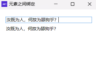 void InitUI() { Title = "元素之间绑定"; // 根据内容自动调整窗口大小 SizeToContent = SizeToContent.WidthAndHeight; StackPanel panel = new(){ Orientation = Orientation.Vertical, Margin = new Thickness(15.0d) }; this.Content = panel; // 布局 // 文本输入控件 TextBox txt = new TextBox(); txt.Margin = new Thickness(3.0d, 5.0d, 3.0d, 8.5d); // 给它分配一个名字,绑定时用到 NameScope myScope = new(); NameScope.SetNameScope(this, myScope); myScope.RegisterName("txtInput", txt); // 文本块 TextBlock tb = new TextBlock(); tb.Margin = new Thickness(5.0d, 0d, 5.0d, 0d); // 绑定 Binding bind = new(); bind.ElementName = "txtInput"; bind.Path = new PropertyPath(TextBox.TextProperty); bind.Mode = BindingMode.OneWay; // 在文本框更改时更新数据 bind.UpdateSourceTrigger = UpdateSourceTrigger.PropertyChanged; BindingOperations.SetBinding(tb, TextBlock.TextProperty, bind); // 添加到布局 panel.Children.Add(txt); panel.Children.Add(tb); }