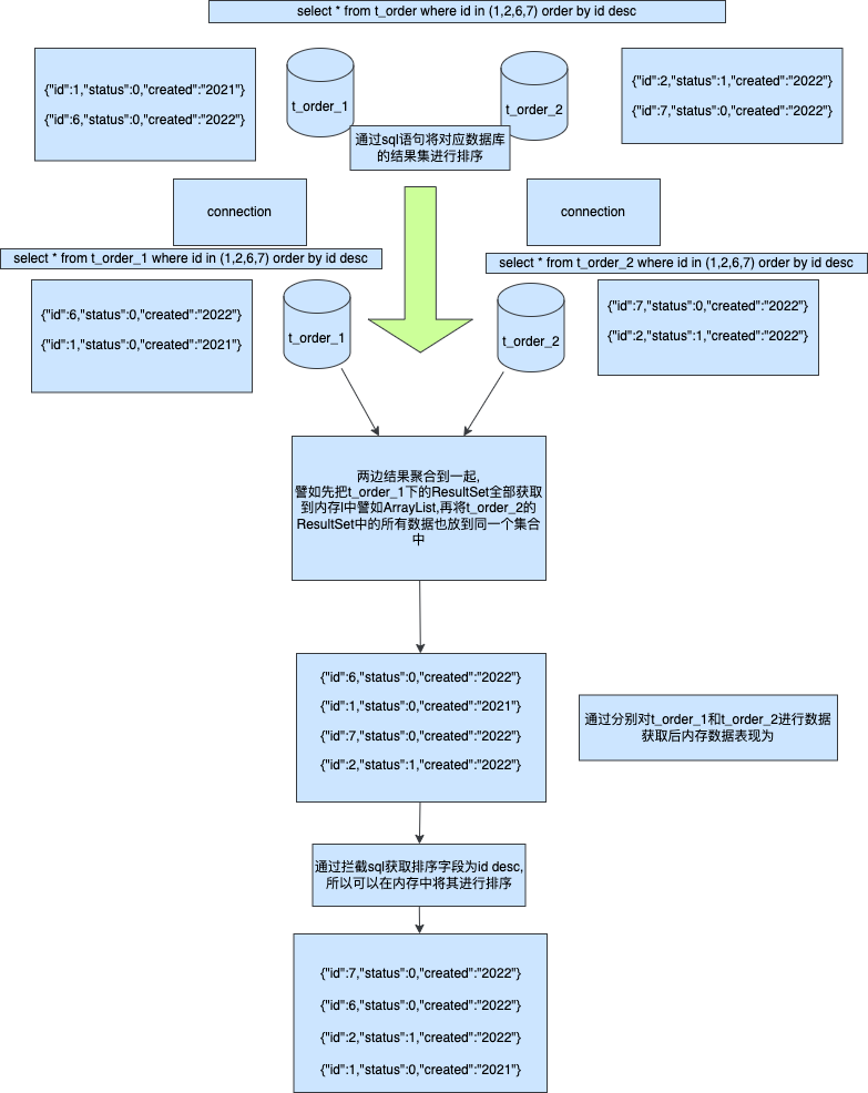 首先我们将执行sql分别路由到t_order_1和t_order_2两张表,并且执行order by id desc将其数据id大的排在前面这样可以保证单个Connection的ResultSet肯定是大的先被返回