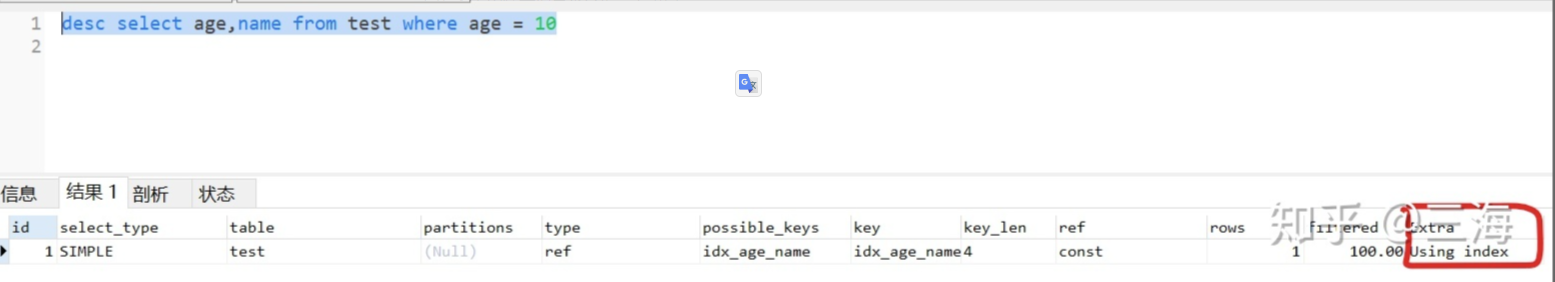 可以看到extra列有一个 *using idnex* , 这个的意思就是使用了覆盖索引,无需回表查询了。