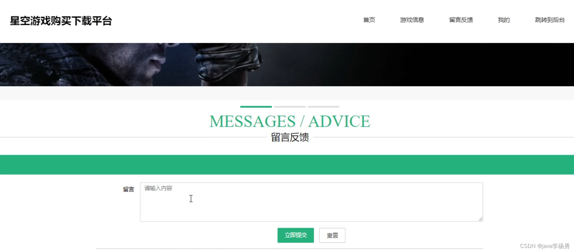 用户进入星空游戏购买下载平台平台可以查看首页、游戏信息、留言反馈、我的、后台等操作,系统前台主界面如图5-1所示。