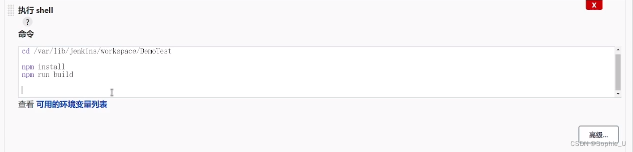 /var/lib/jenkins/workspace/DemoTest,但不排除有时不是这个路径,所以可以使用jenkins环境变量的方式来直接进入。$WORKSPACE(Linux环境中),如jenkins安装在windows系统下,则是%变量名%的形式cd $WORKSPACE