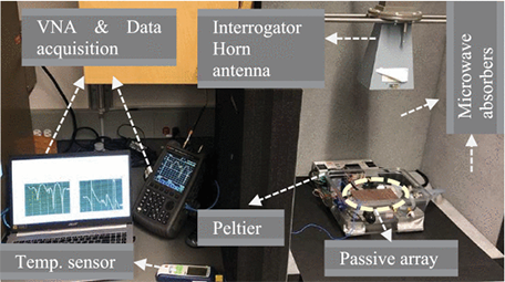 SRR的无源阵列是在罗杰斯杜罗德基底的厚度为0.787毫米。使用工作频率为2.6至4.0GHz)且增益为10dBi的标准增益喇叭天线作为询问器。SRR阵列放置在帕尔贴设备上,位于询问器喇叭天线的视线范围内。询问器天线的孔径与阵列之间的距离为33厘米。这个3.0-GHz设计频率的距离确保阵列被放置在天线的远场区域,孔径为12厘米。