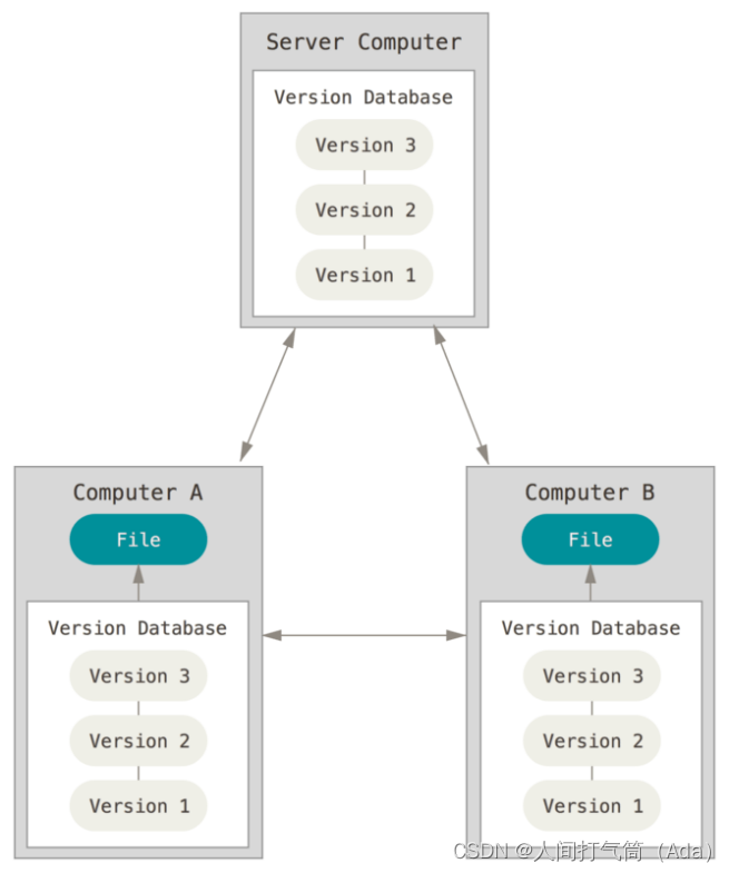 这类系统,诸如 CVS、Subversion(SVN) 以及Perforce 等,都有一个单一的集中管理的服务器,保存所有文件的修订版本,而协同工作的人们都通过客户端连到这台服务器,取出最新的文件或者提交更新。多年以来,这已成为版本控制系统的标准做法。