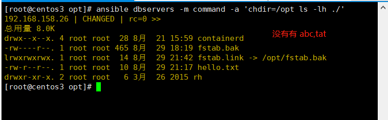 - ansible dbservers -m command -a 'chdir=/opt ls -lh ./'