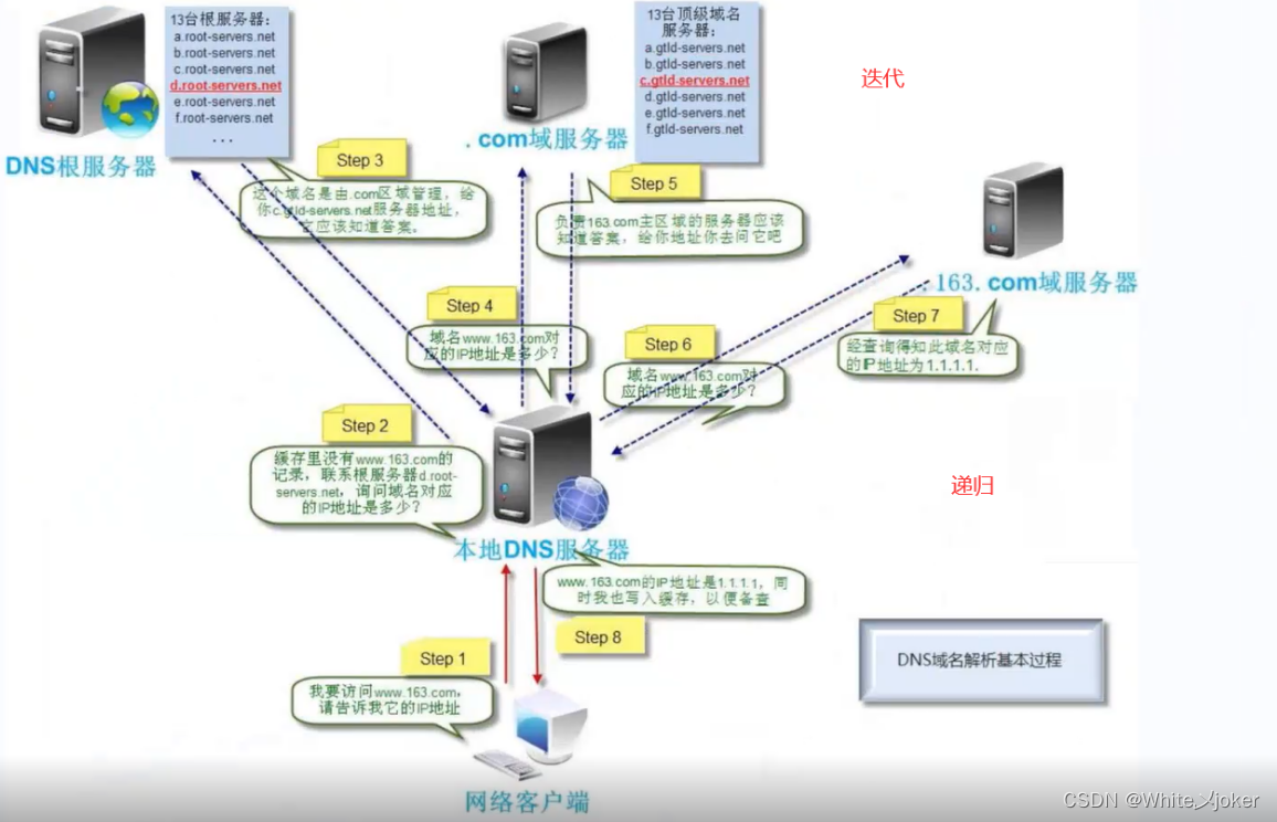 迭代解析(反复)--- DNS服务器在收到用户发起的请求时,并不直接回复查询结果,而是告诉另一台DNS服务器的地址,用户再向这台DNS服务器提交请求,依次反复,直到返回查询结果